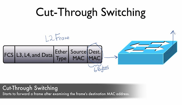 Basic Cut-Through Switching what we responsible for understanding CCNA exam is that with Cut-Through switching, as soon as switch sees those first 6 Bytes (48 bits), as soon as sees destination mac address, it can start forwarding that frame.